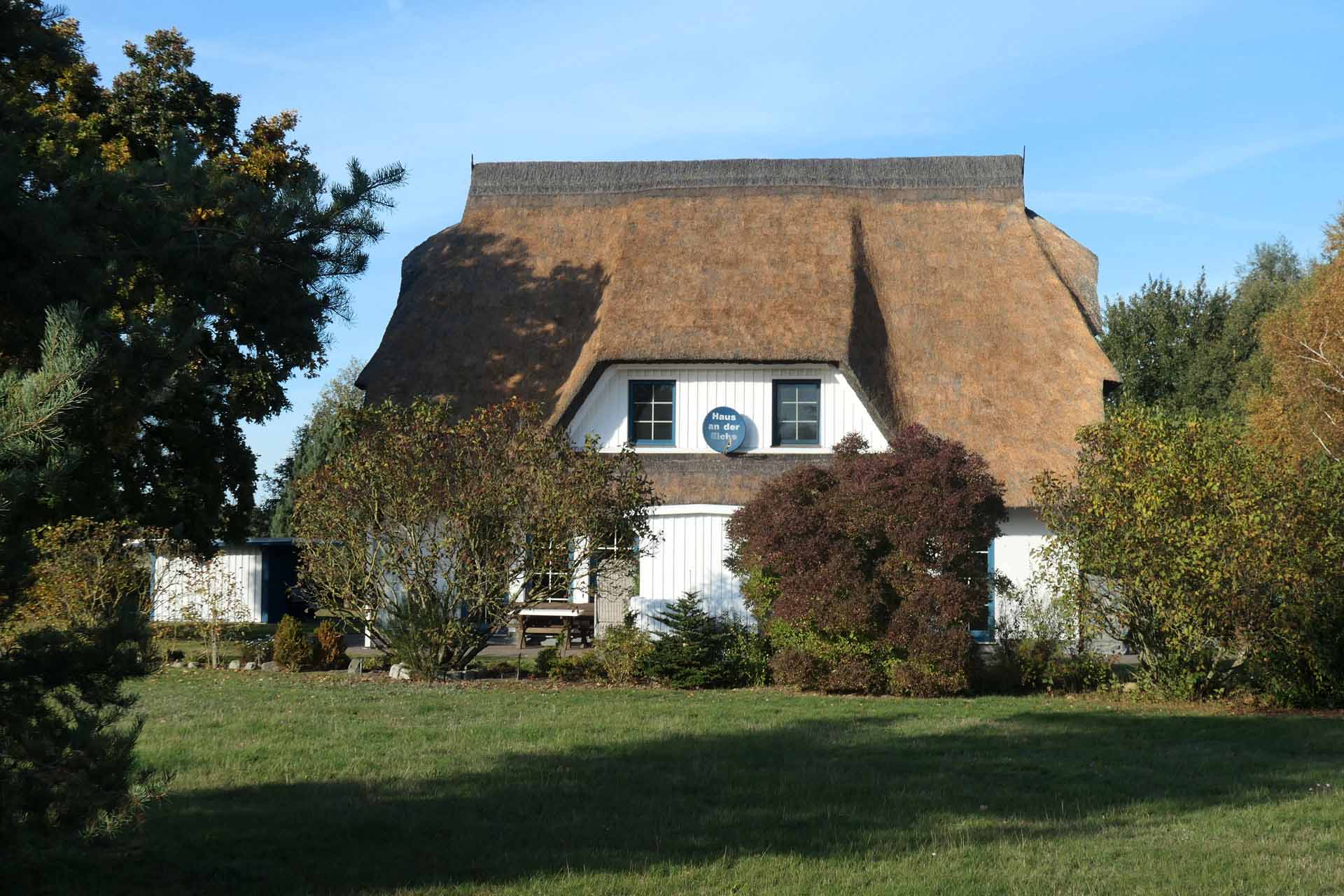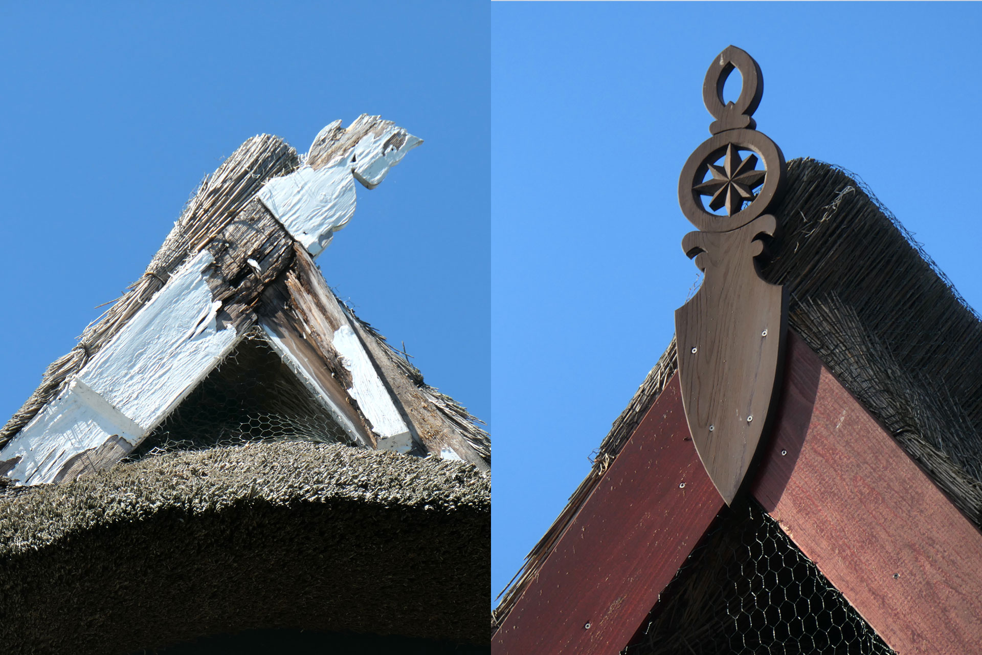 neue GiebelzeichenÜber die Jahre hatten Wind und Wetter die Giebelzeichen unseres Reetdachs ruiniert. Ein Frühjahrssturm im März hat sie dann engültig vom Dach geholt. Im Sommer haben wir sie erneuert. Dabei haben wir die ursprünglich aus Niedersachsen stammenden gekreuzten Pferdeköpfe durch regional übliche Zeichen aus der Werkstatt von Meister Rohloff in Prerow ersetzt. |