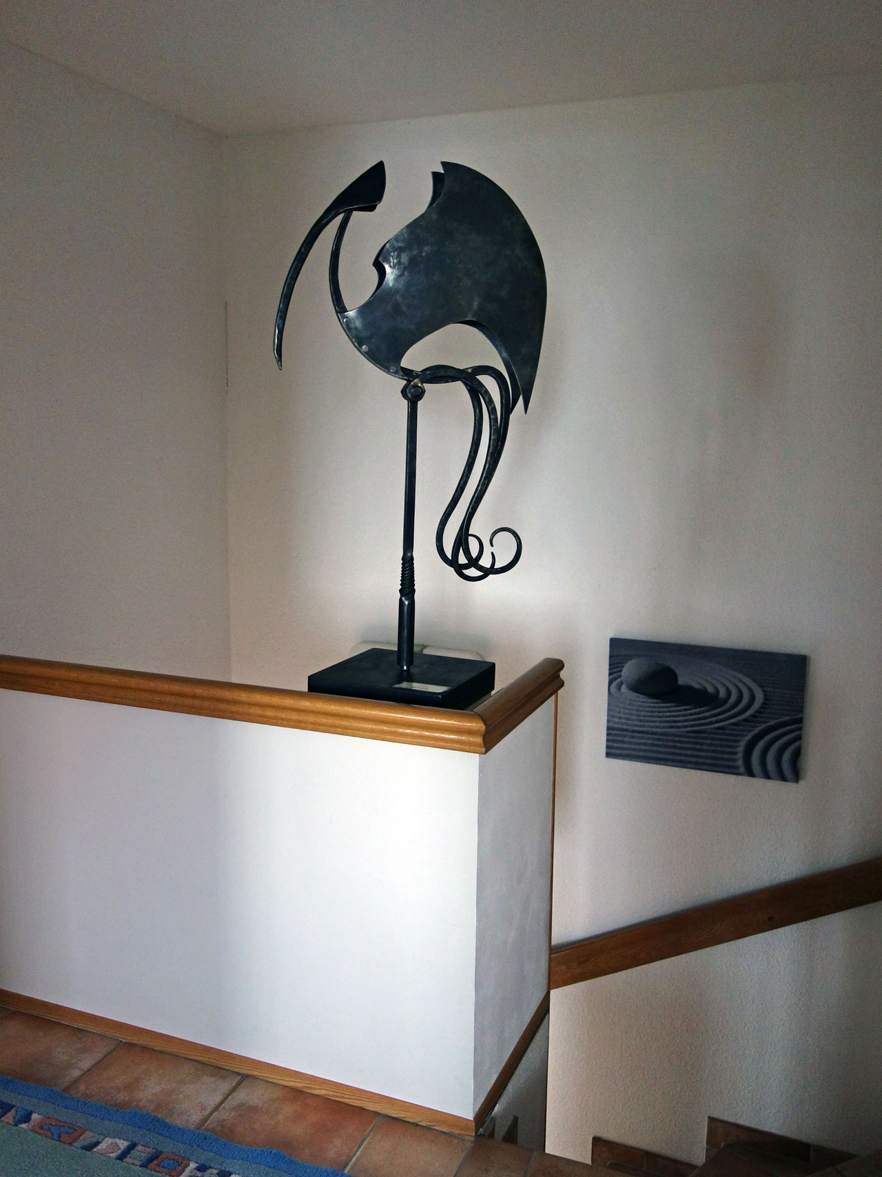 Kunst am BauDie Vogelskulptur im Treppenhaus ist das Gesellenstück unseres Sohnes Stefan in seiner Ausbildung zum Schmied (Metallgestalter) 2004. Die Aufgabe war, eine Wetterfahne zu entwerfen und zu fertigen.