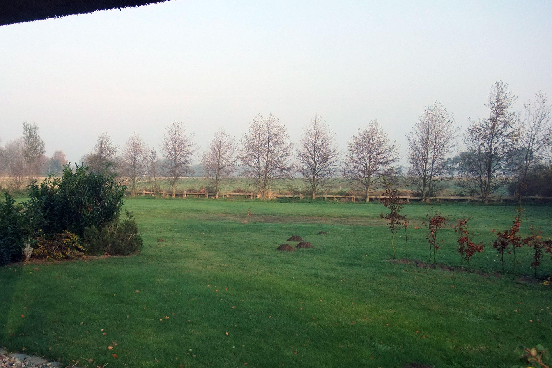 Freie Sicht nach NordenUnsere erste Aktion war das Auslichten der Baumreihe an der nördlichen Grundstücksgrenze. Die Bäume standen dicht an dicht und versperrten die schöne Aussicht auf das Landschaftsschutzgebiet "Schwinkels Moor" im Norden. Wir haben den Blick geöffnet. |