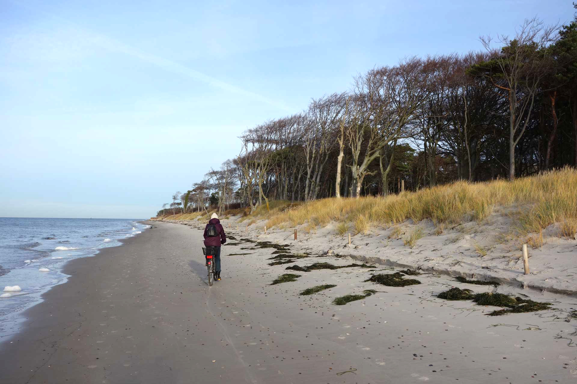 Am Langenseerweg links abbiegen und dann 3,3 km auf wunderschönem Weg durch den Darßer Urwald bis zum Weststrand. Vor den Dünen gibt es Fahrradabstellplätze. Von hier aus kann man auf dem selben Weg zurückfahren.