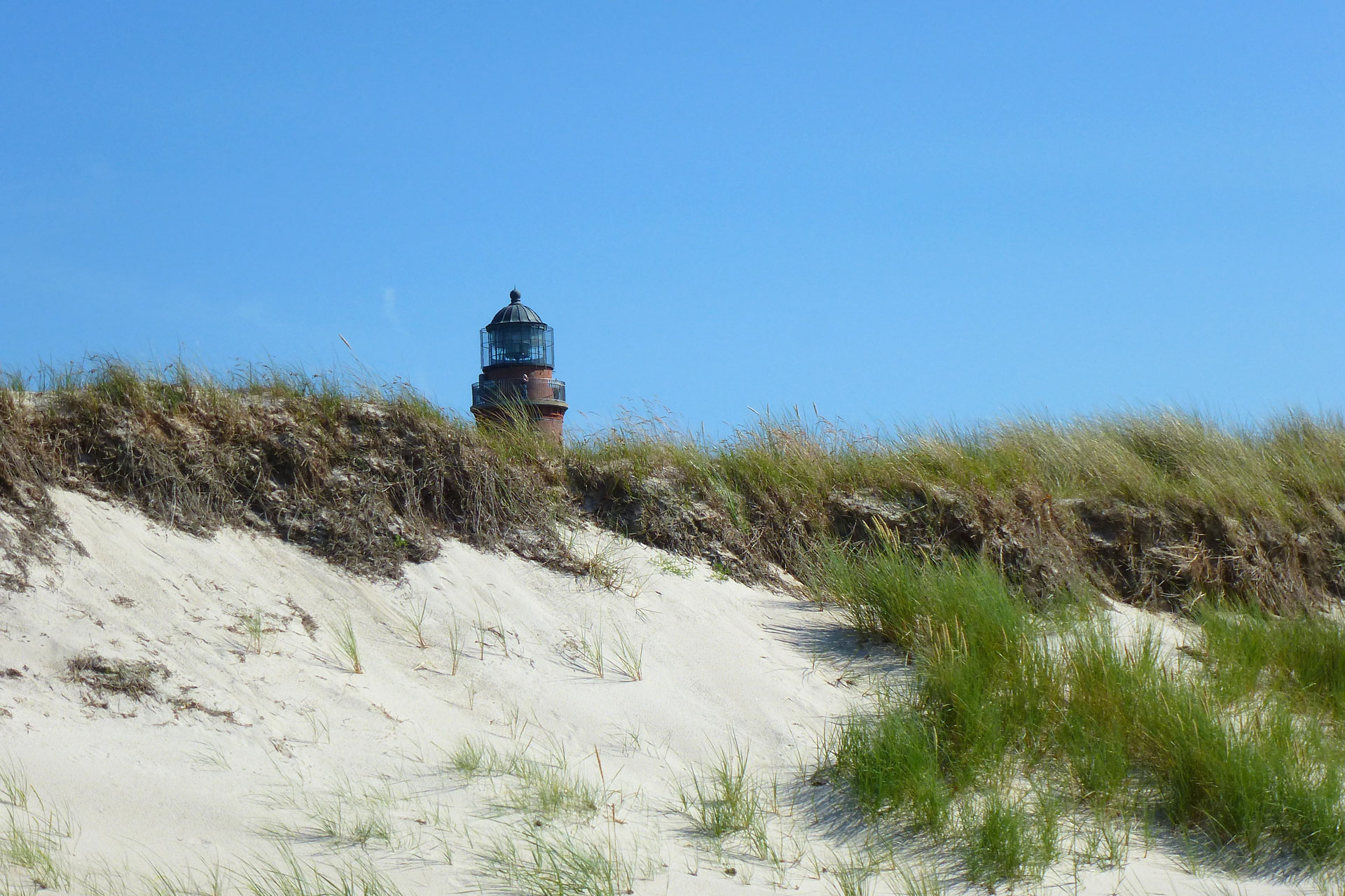 100 m hinter dem Darß-Museum rechts abbiegen und auf dem „Bernsteinweg“ bis zur Einmündung „Villenstraße“ am Ende der Bebauung. Dort nach links in den Darßwald abbiegen und dem Leuchtturmweg bis zum Leuchtturm Darßer Ort folgen (ca. 5 km).